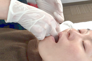 お口の内側からの施術では、粘膜の下にある筋肉(咀嚼筋)に触れます。
